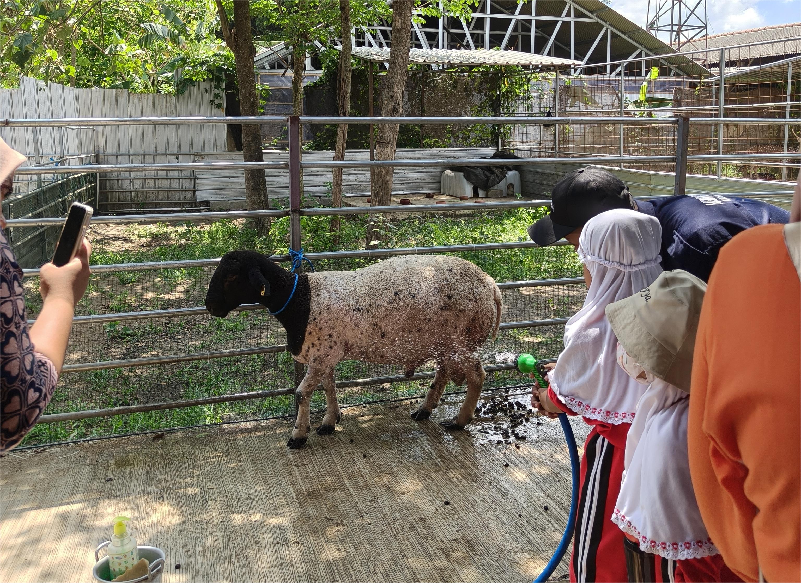 Kegiatan memandikan domba menjadi momen yang tak kalah seru. Anak-anak diajak membersihkan bulu domba menggunakan air dan sabun lembut. Selain membuat domba menjadi bersih, kegiatan ini mengajarkan pentingnya kebersihan hewan ternak dan lingkungan peternakan. Tawa ceria dan semangat anak-anak menjadikan suasana farm semakin hidup dan hangat.