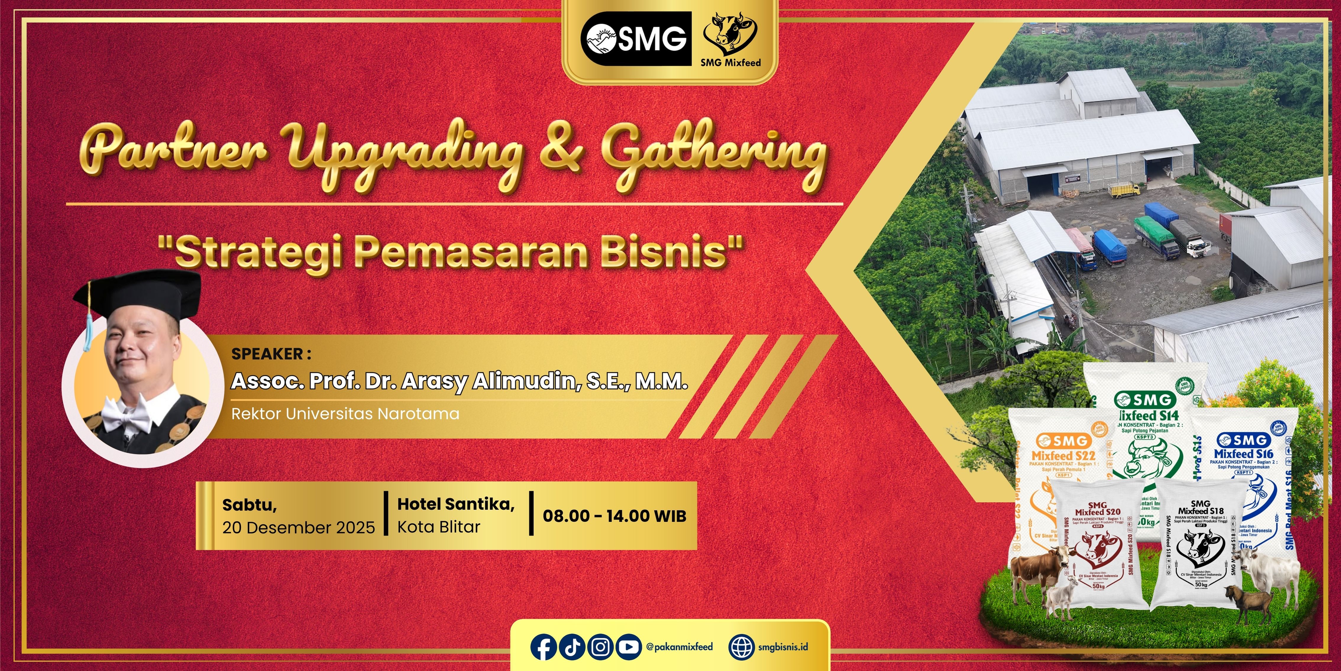 SMG Mixfeed akan menggelar kegiatan Partner Upgrading & Gathering dengan pemaparan materi dengan judul “Strategi Pemasaran Bisnis” pada Sabtu, 20 Desember 2025, bertempat di Hotel Santika, Kota Blitar, mulai pukul 08.00 hingga 14.00 WIB.
